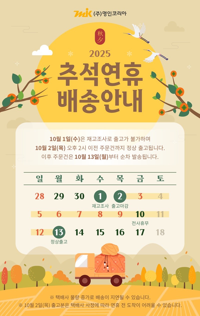 [공지] 2025년 추석 연휴 배송 안내 ![]() ![]() |